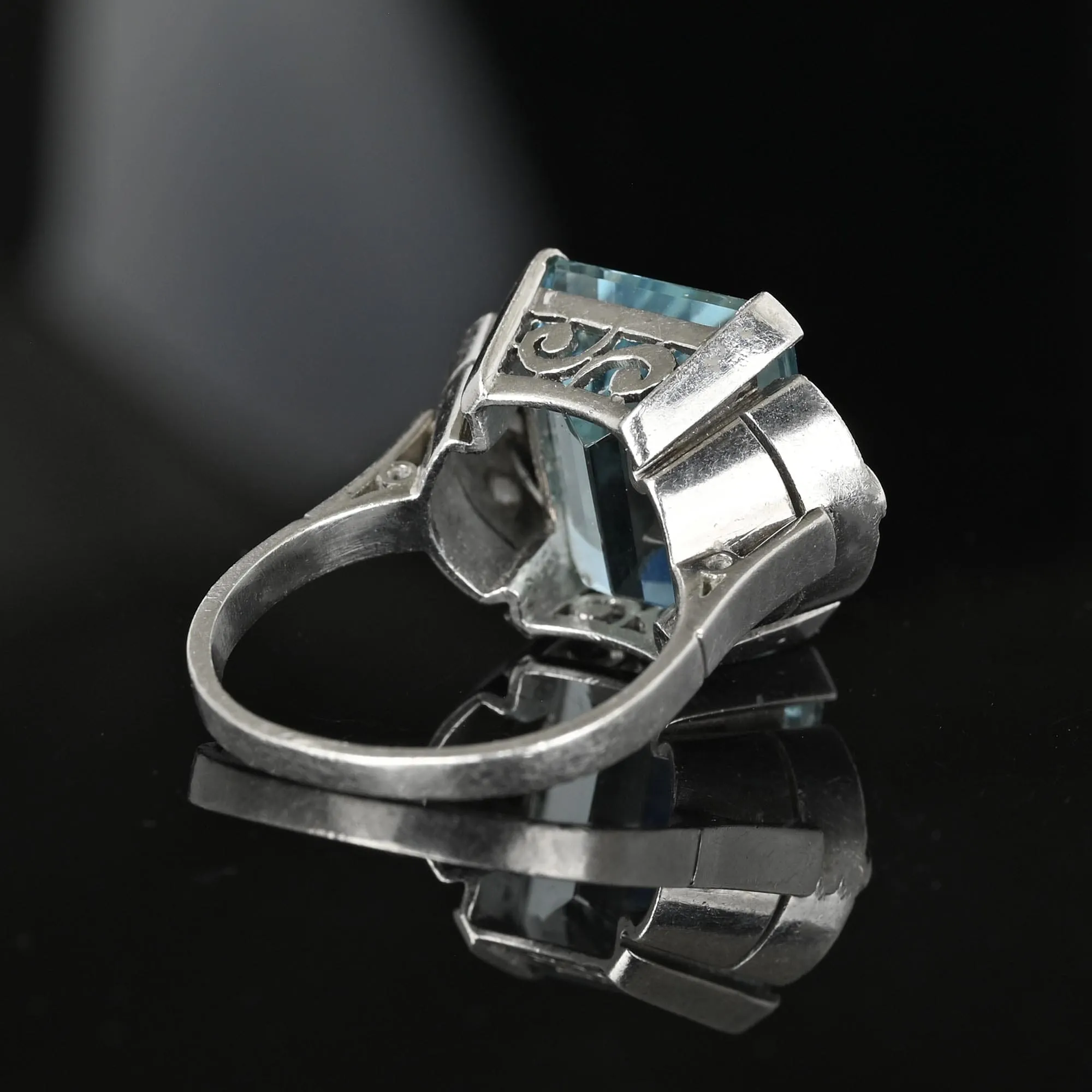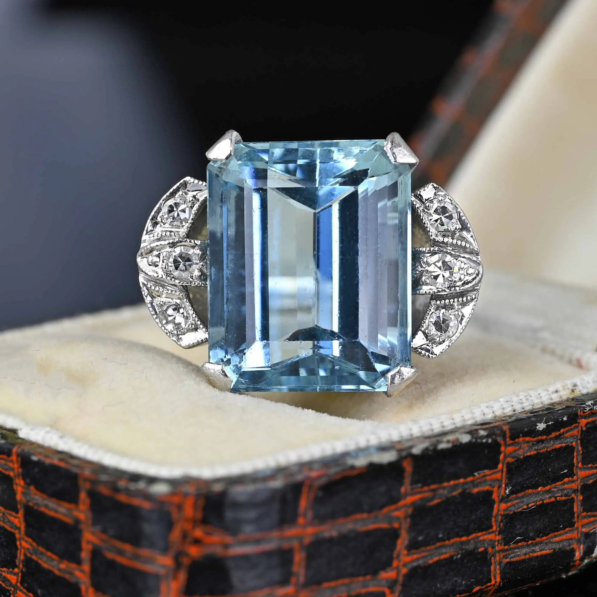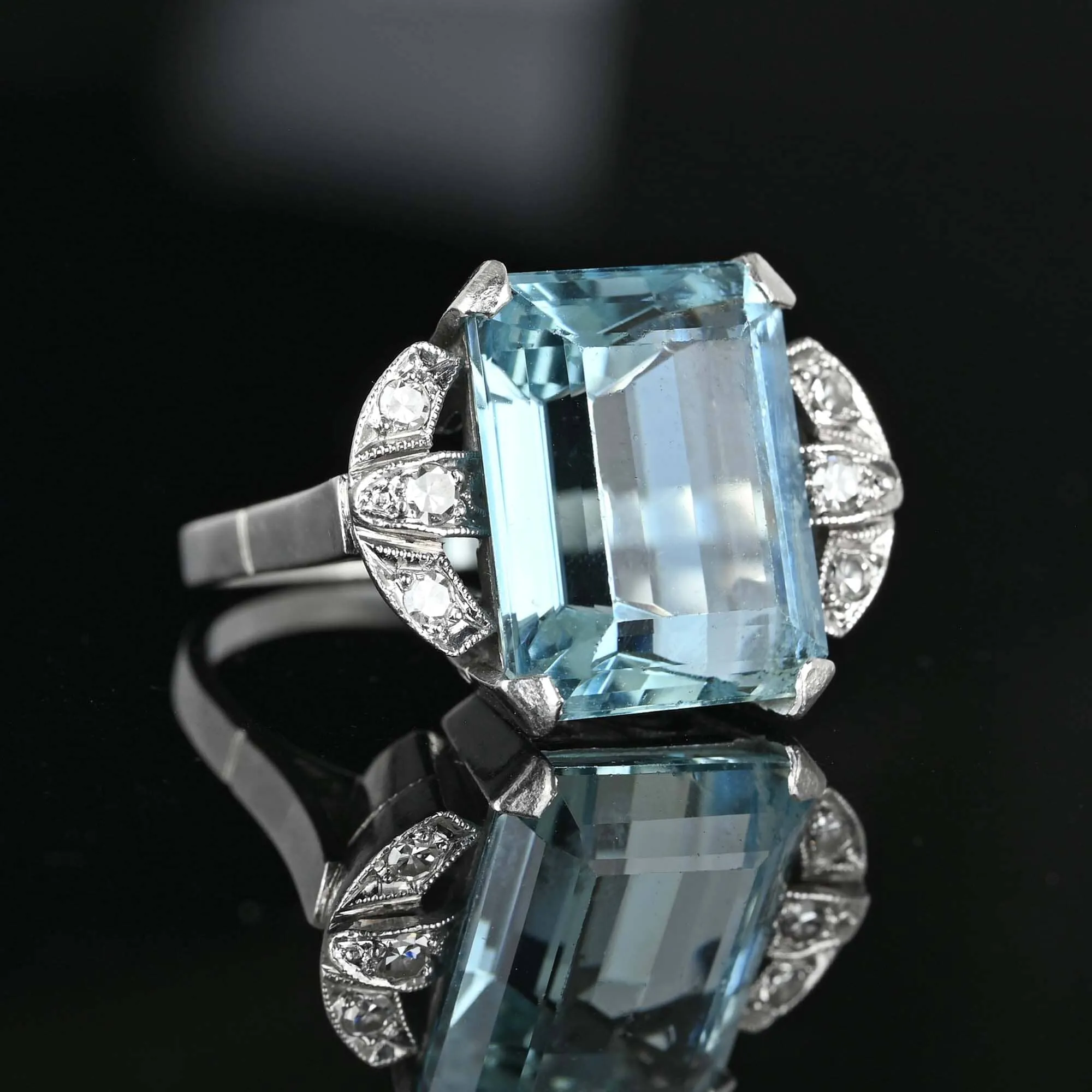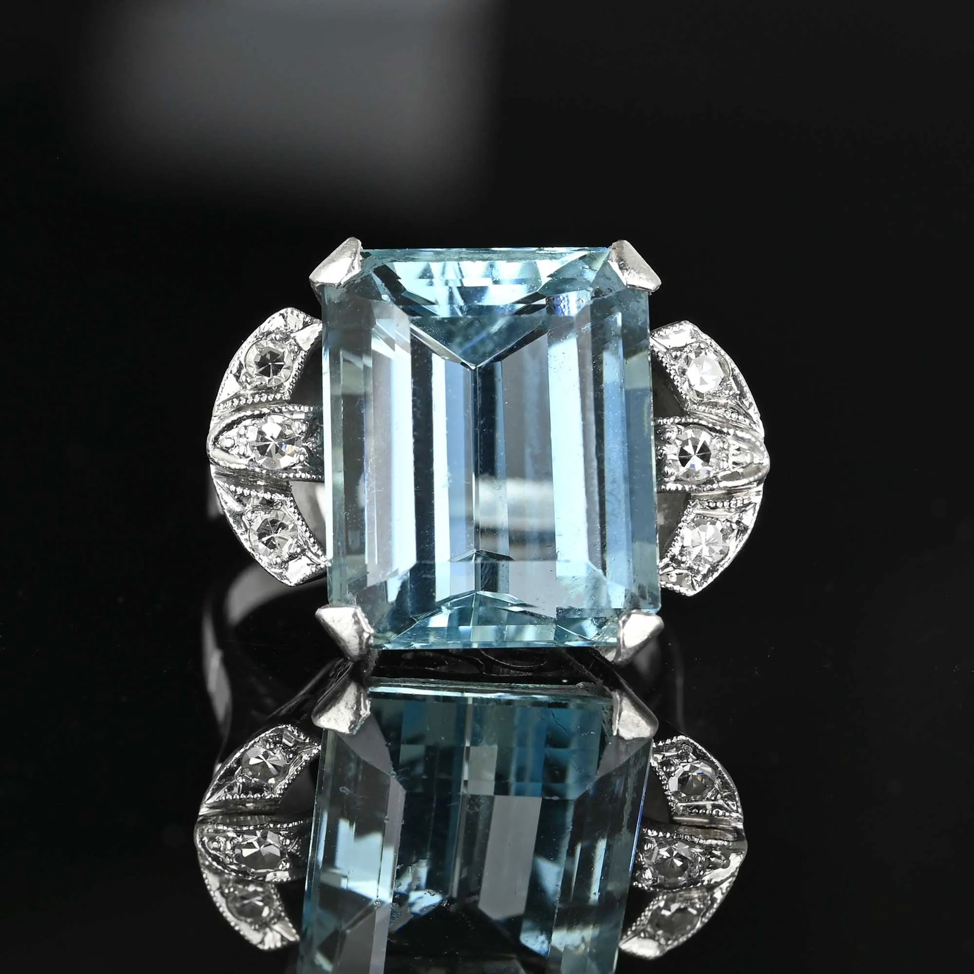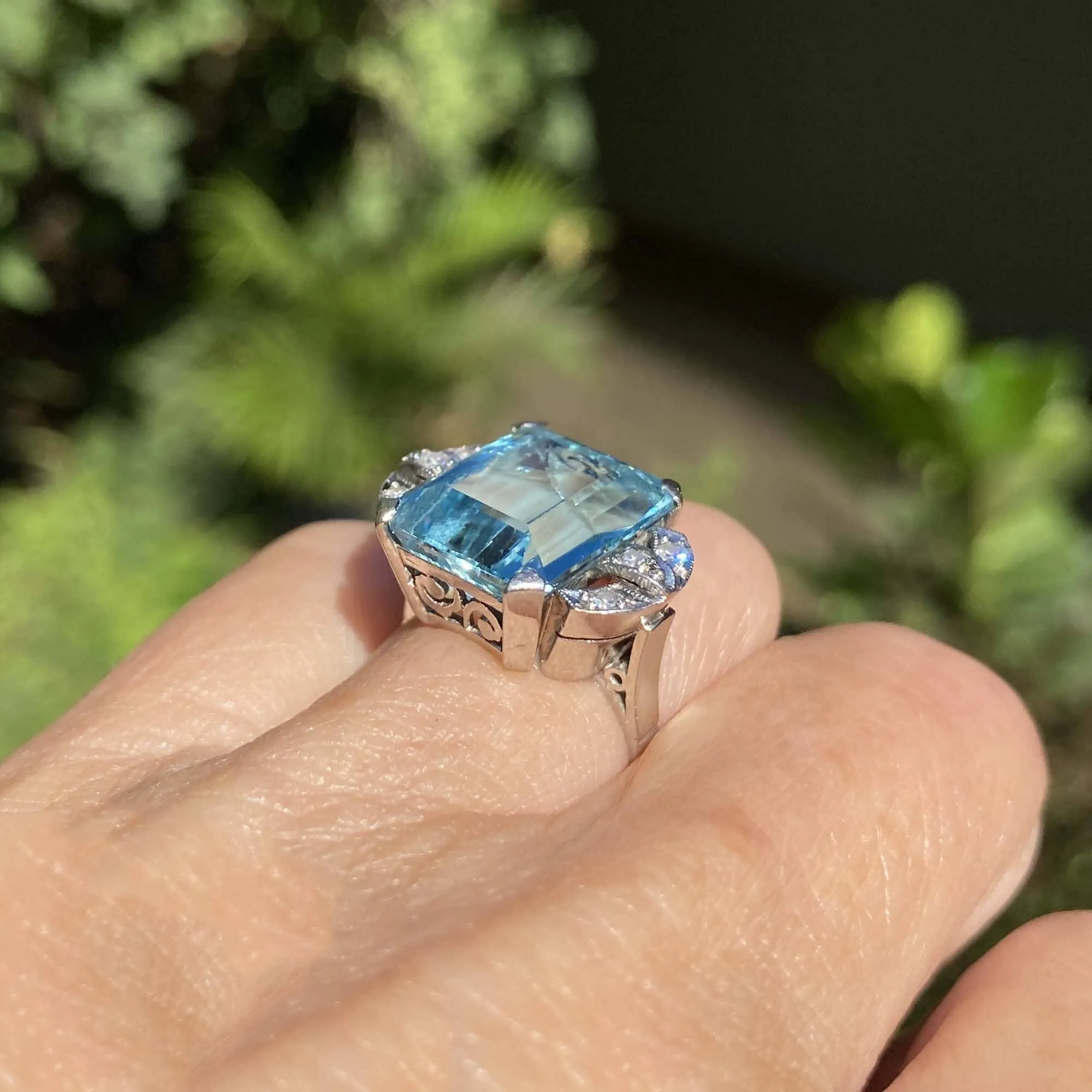 A stunning vintage Art Deco ring, rendered with an exquisite 8.15 carat step-cut aquamarine of intense blue hue, ensconced in prong-set diamond arches, bordered with milgrain and elevated atop a sturdy and ornate platinum gallery, with cutouts of swirls adorning the top and bottom. An exclusive one-of-a-kind cocktail statement piece!
