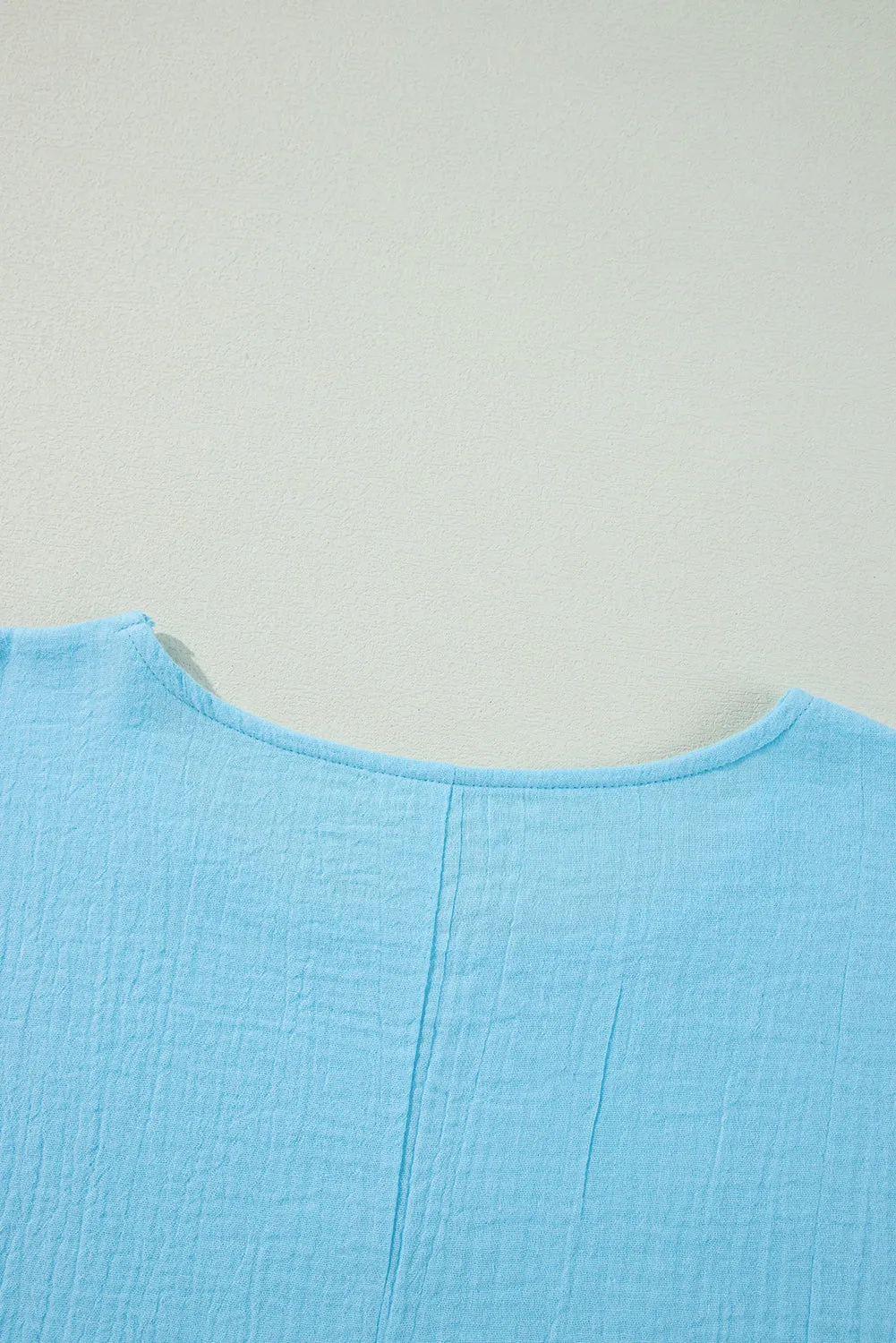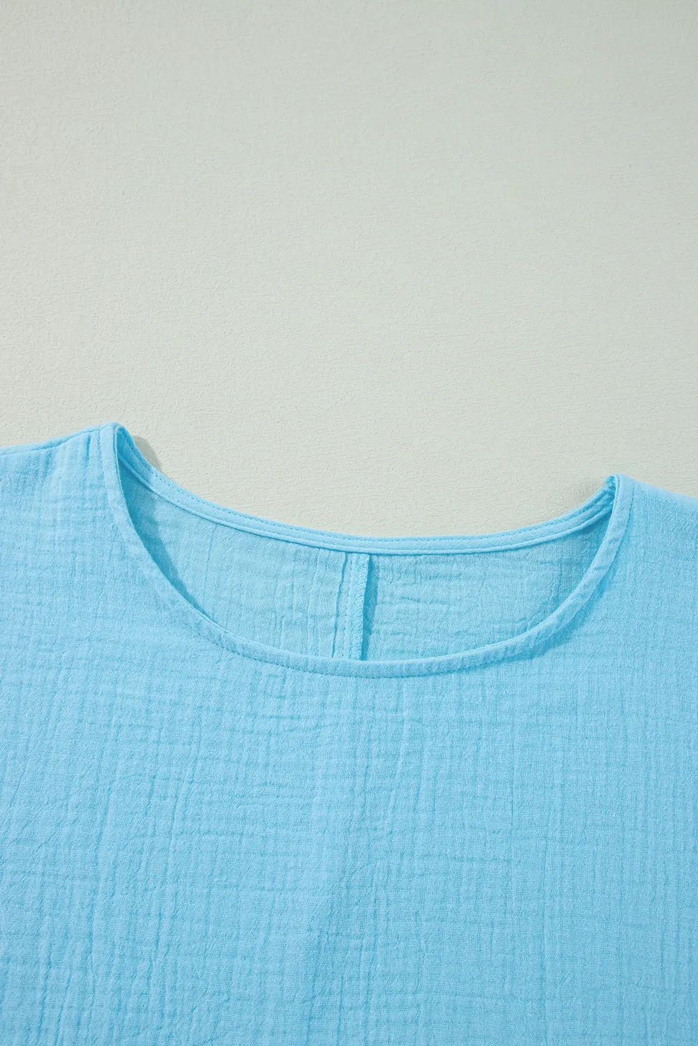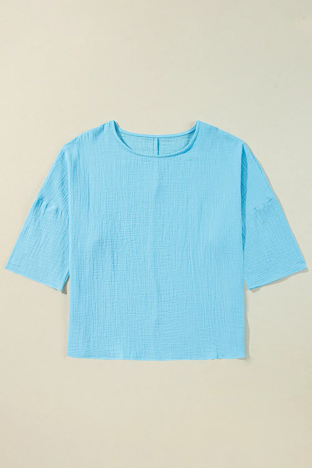 Discover the perfect addition to your wardrobe with this effortlessly chic blouse. Designed with a unique crinkled texture, it offers a sophisticated look that elevates any outfit. The elegant bracelet sleeves add a touch of refinement, making it suitable for both casual gatherings and elegant events.