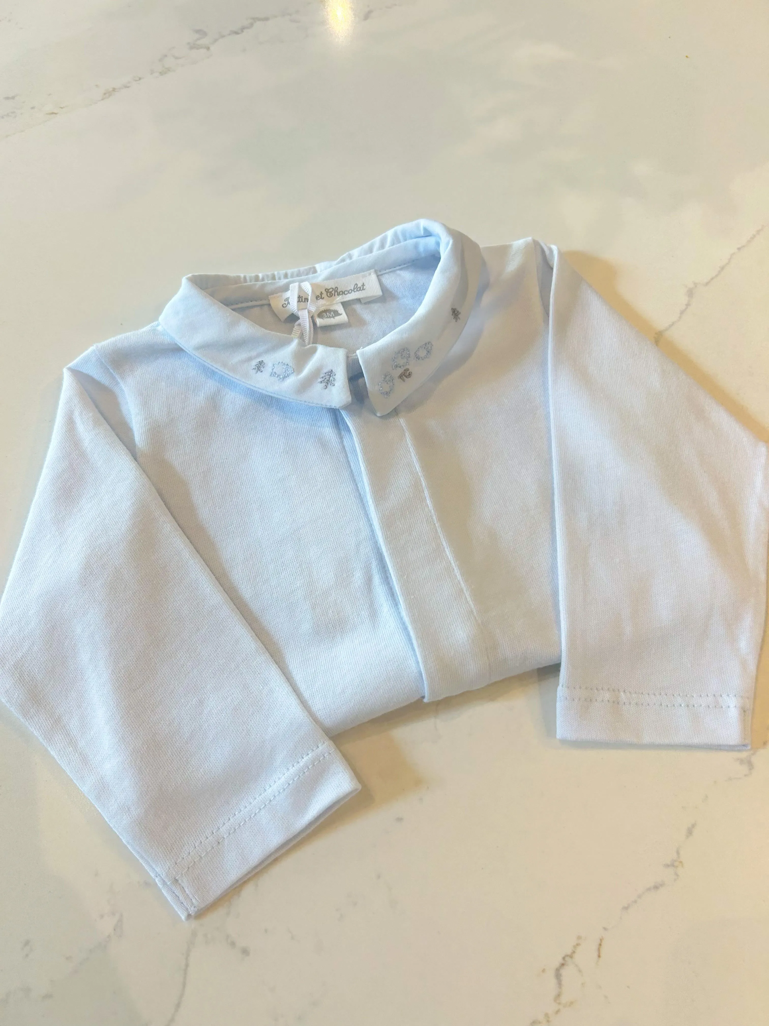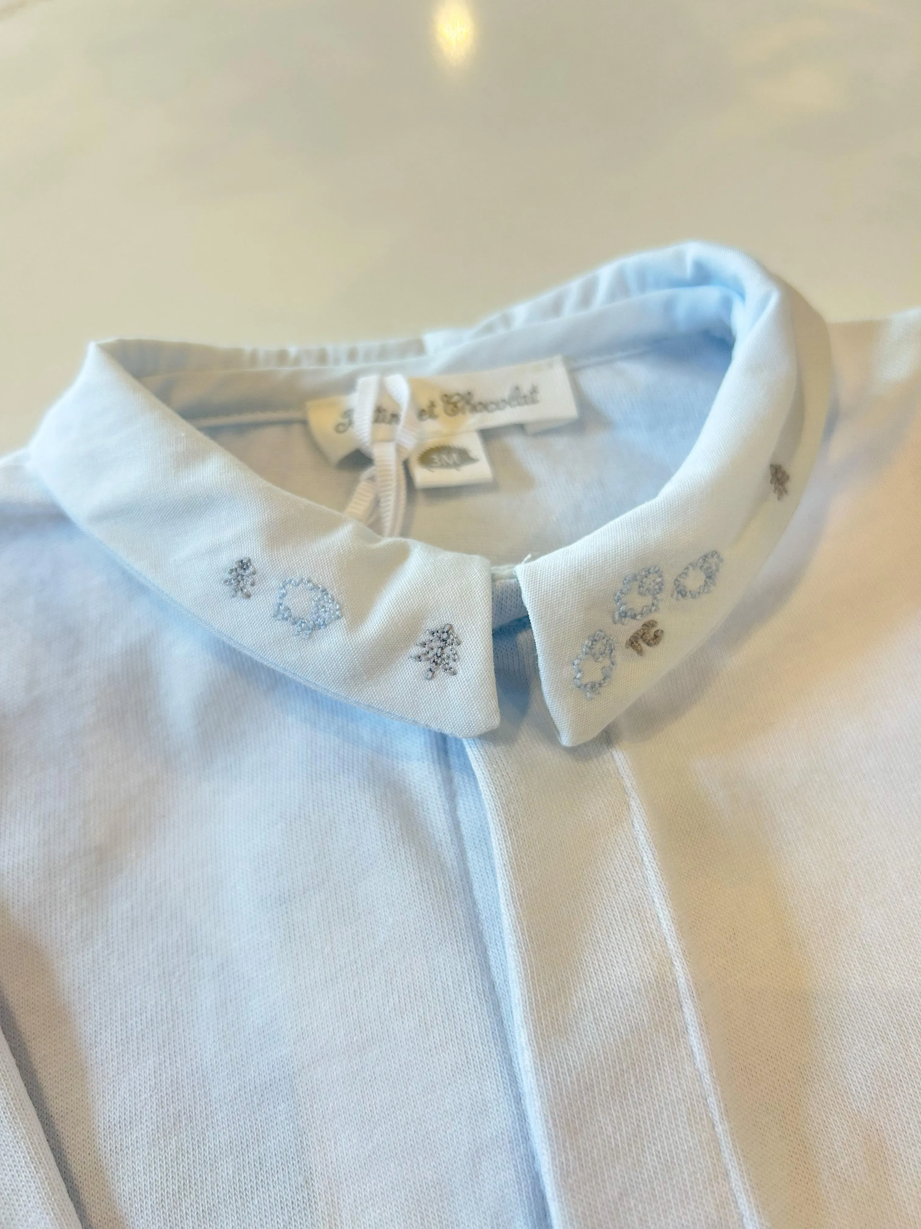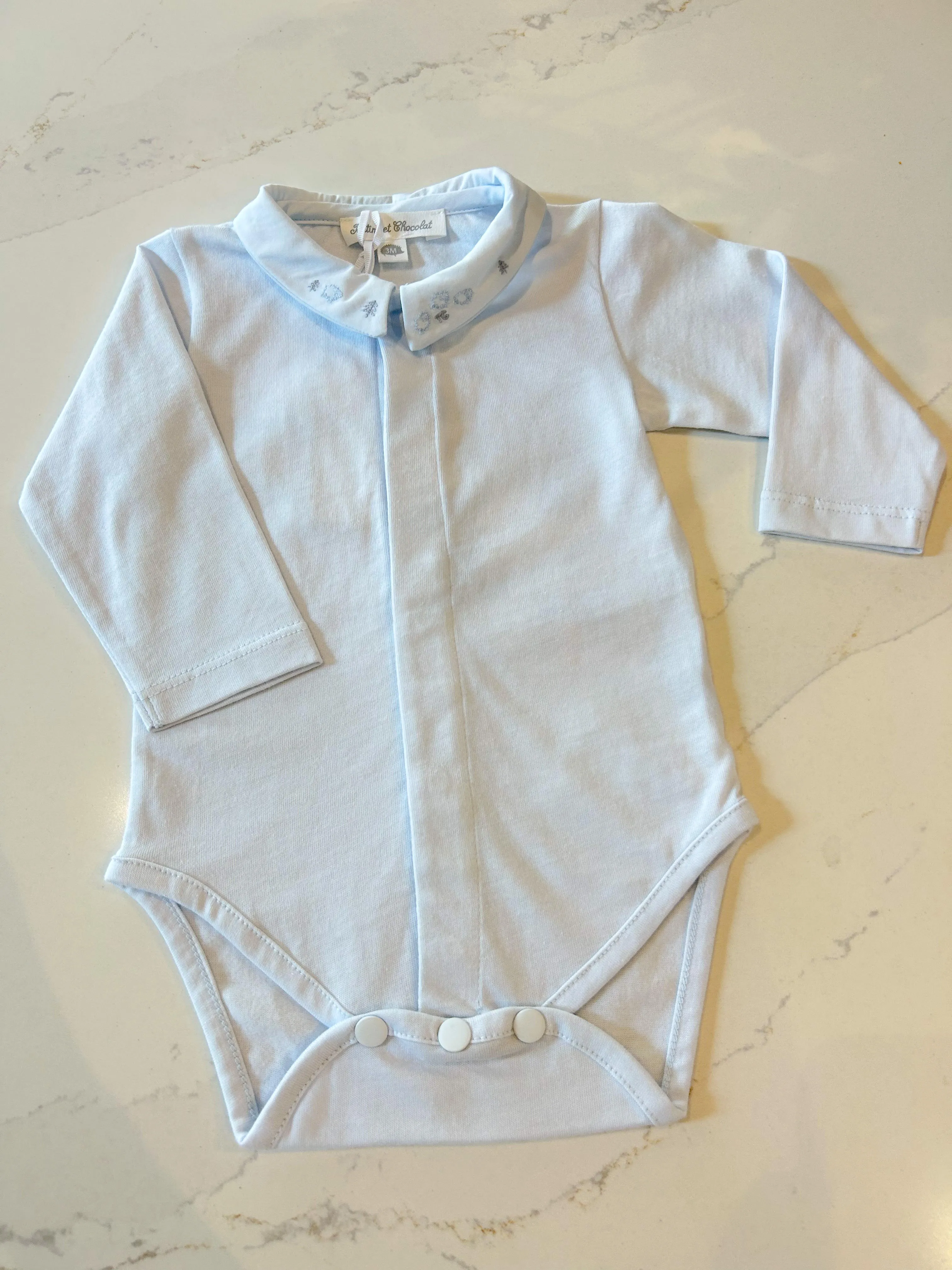 Make dressing your baby boy effortless with this sky blue bodysuit featuring delicate embroidery of sheep on the collar. Its buttons on the front and crotch make it easy for you to quickly get them ready for the day.