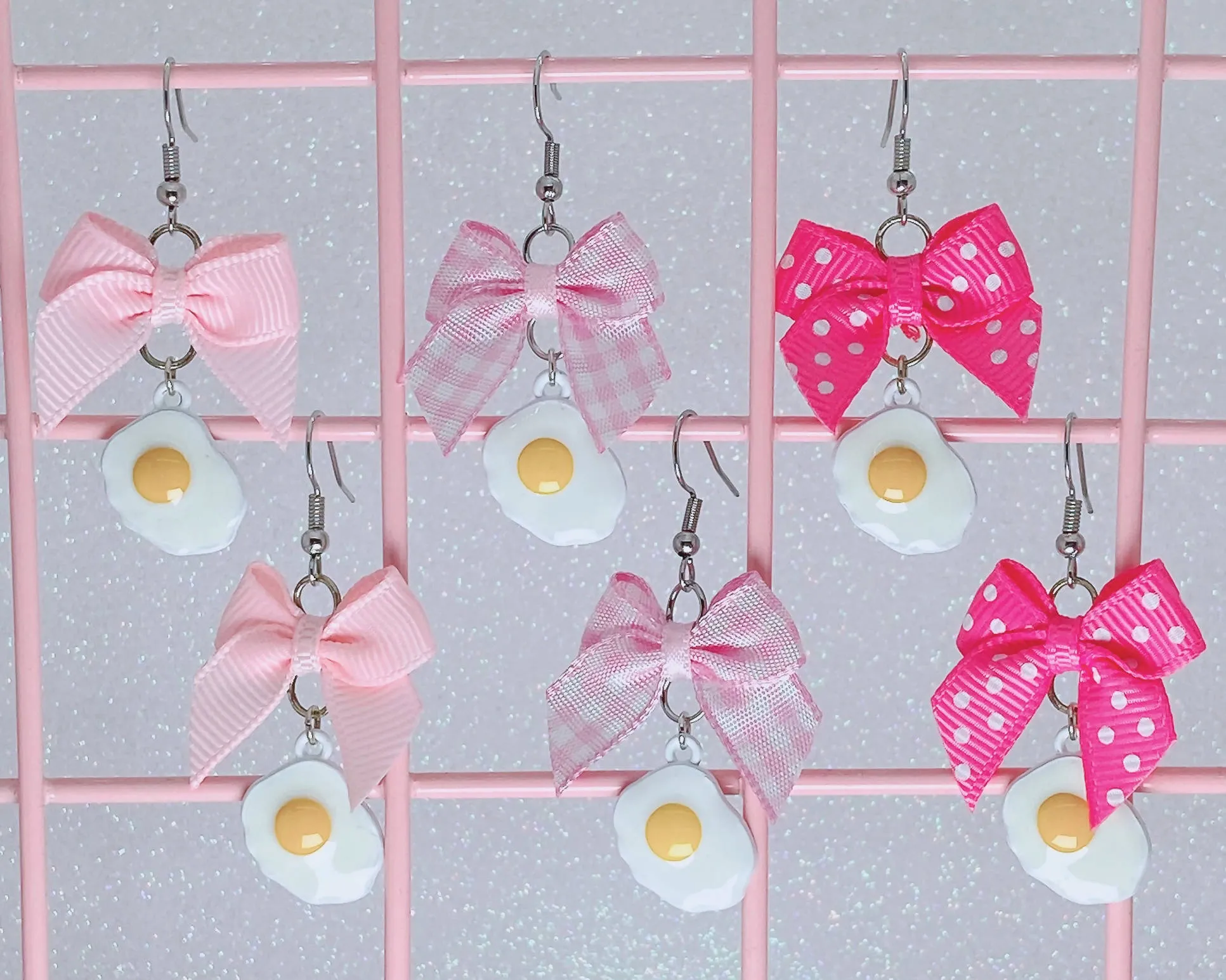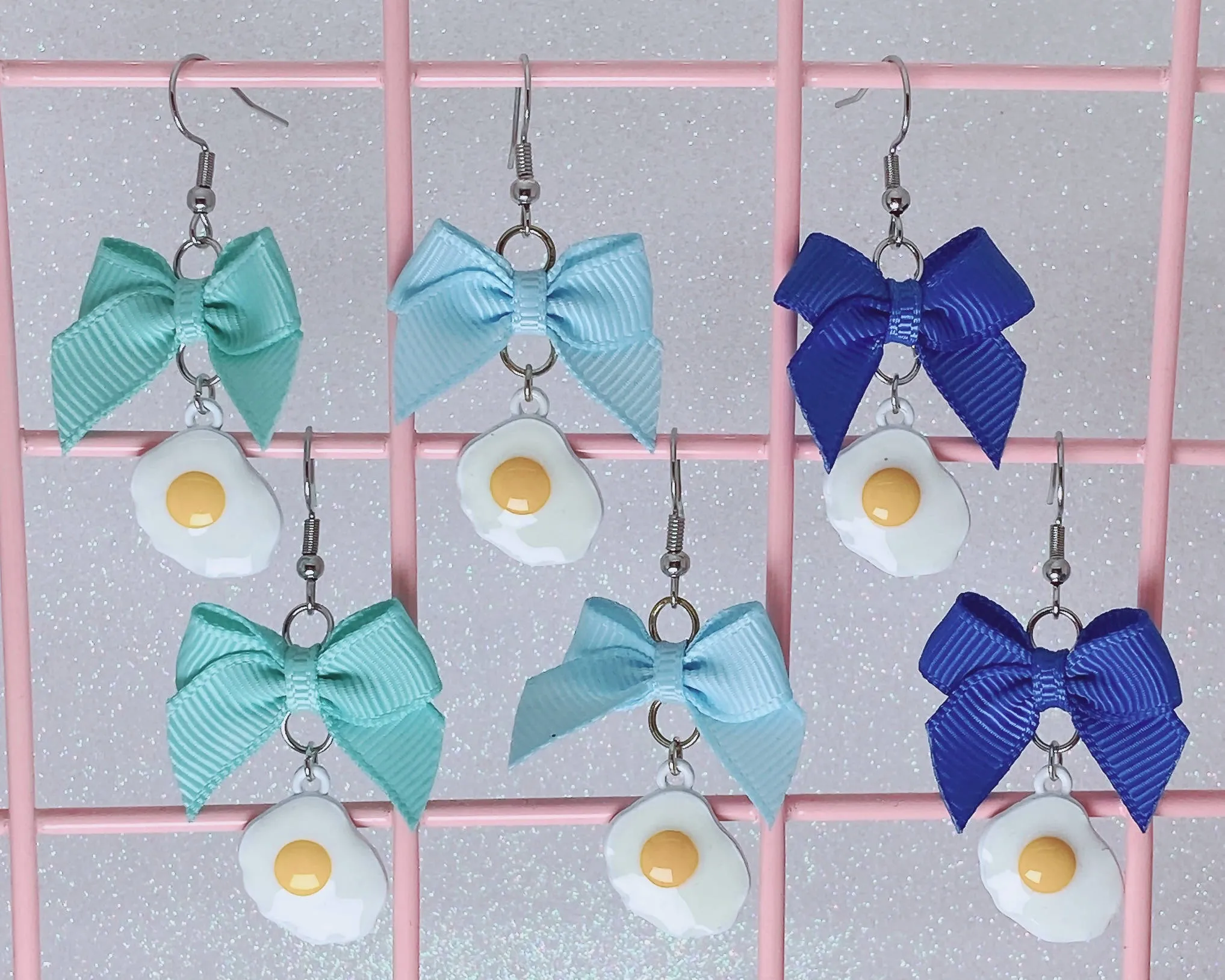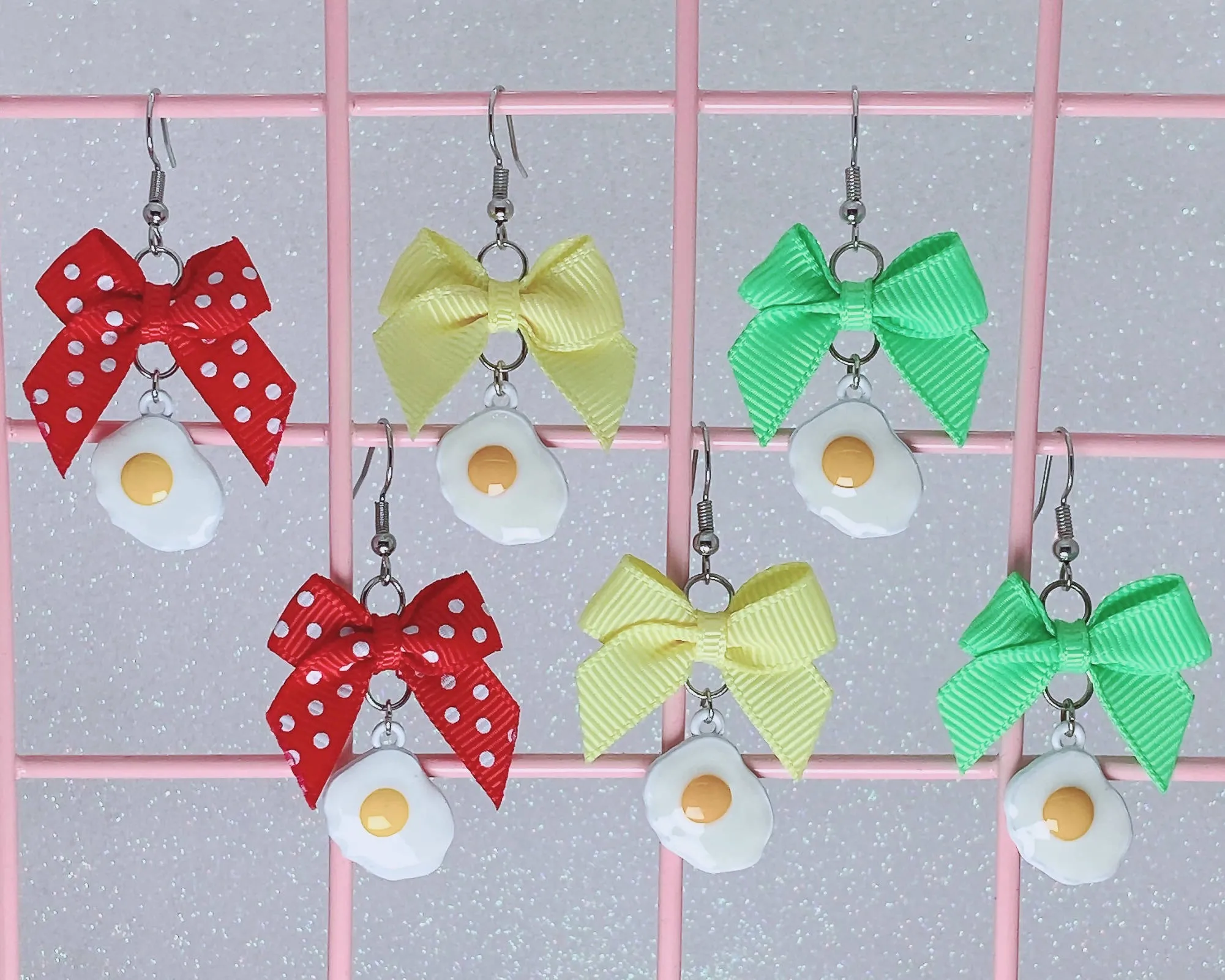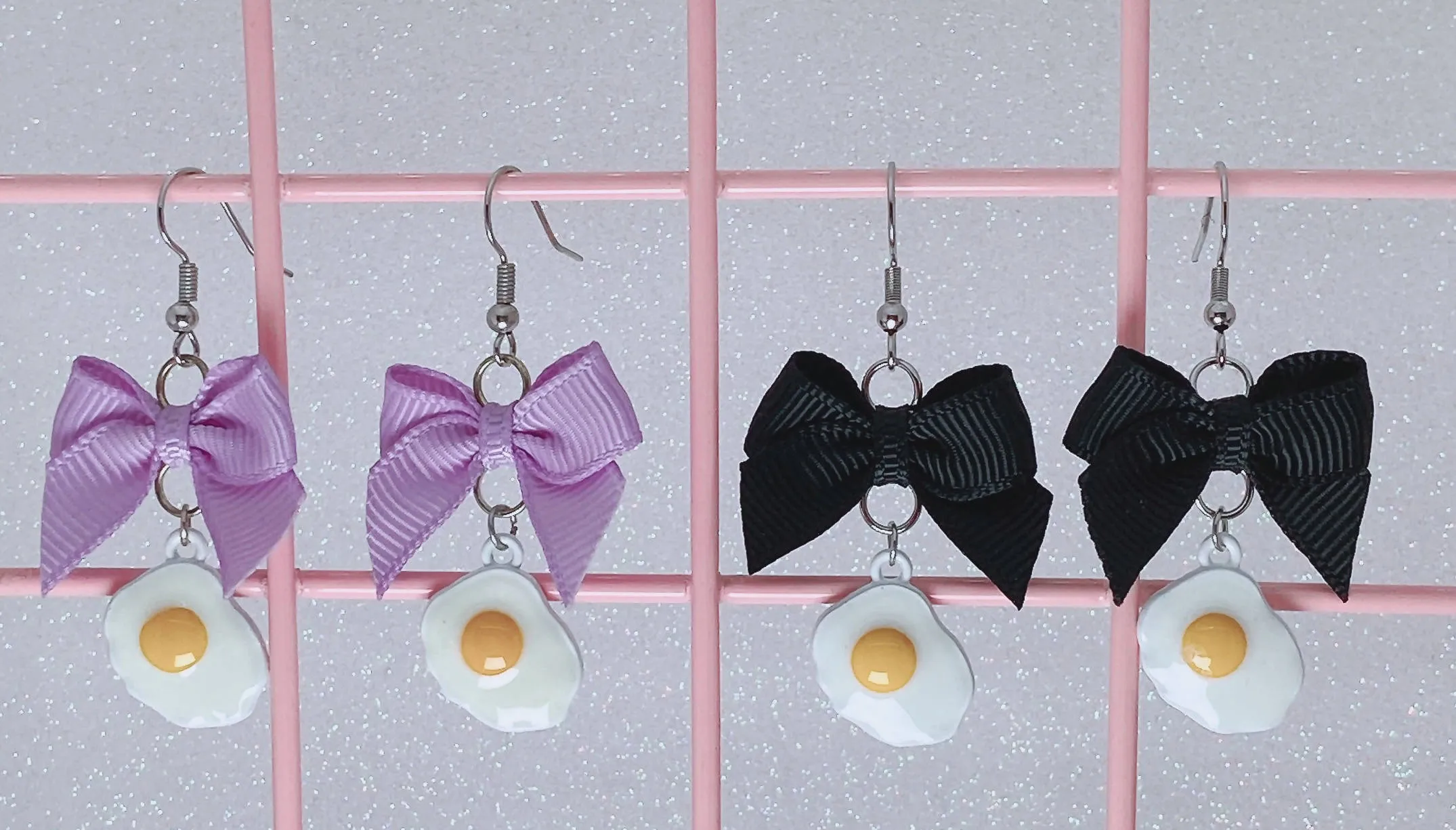 Show your excellent taste with the Fried Egg Earrings from Interspecies Friendship. Cute enamel eggs dangle below colorful grosgrain bows on these simple and adorable kawaii earrings.